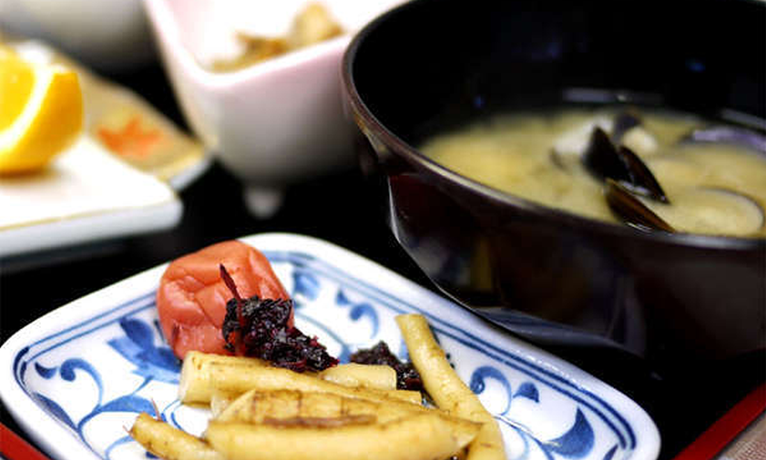 レストランにて、和定食をご用意致します。飲みすぎた時に嬉しい、小川原湖で獲れたシジミの味噌汁はおすすめです。